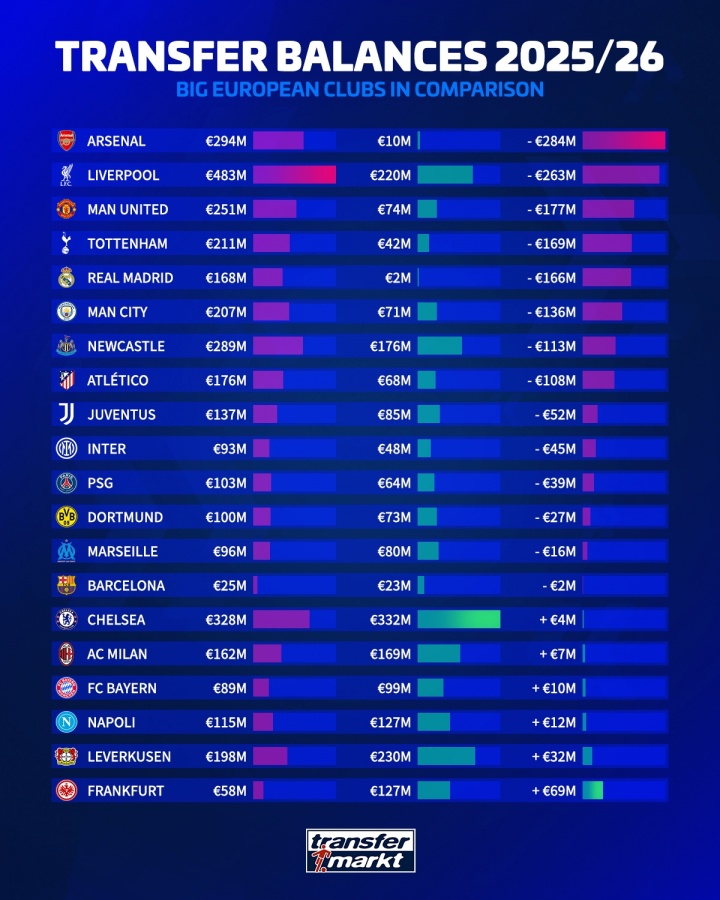 值得一提的是,巴塞罗那、切尔西和AC米兰等球队实现了转会盈余,而法兰克福则以6900万欧元的盈利表现突出。