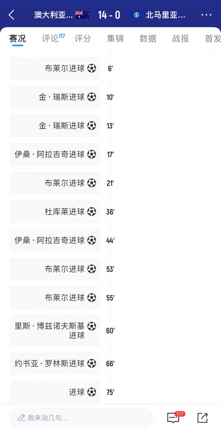 在此前首轮资格赛中,澳大利亚队曾以14-0大胜北马里亚纳群岛,仅上半场就攻入七球。