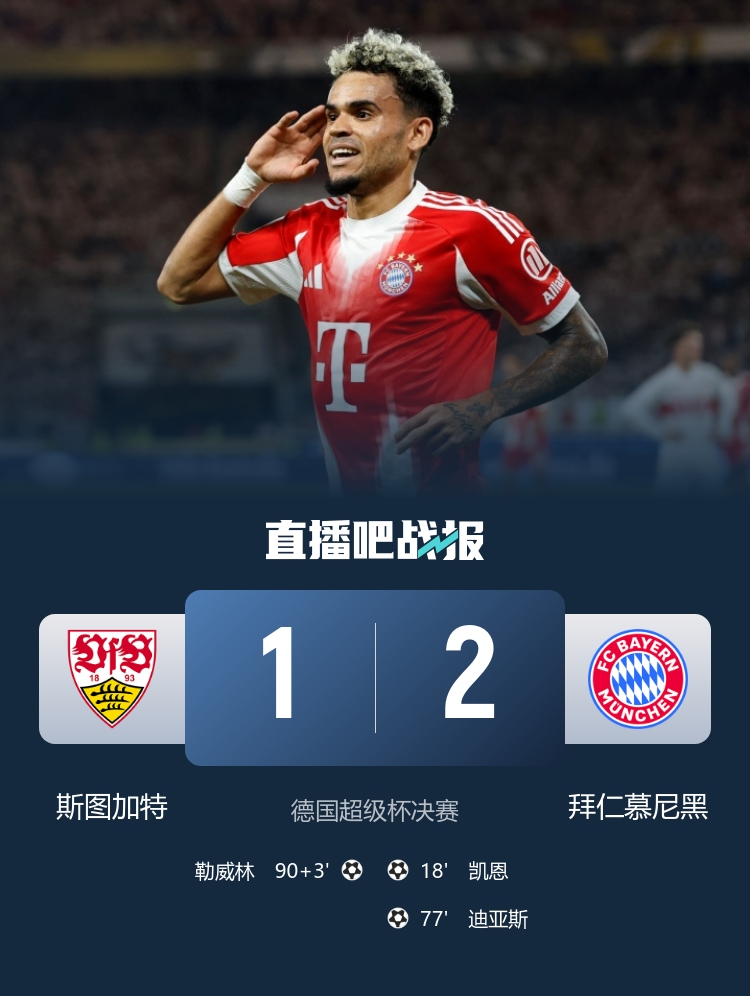 赛季首冠!拜仁2-1斯图加特问鼎德超杯 凯恩抽射破门迪亚斯首球
