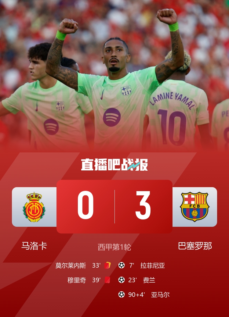 巴萨3-0击败9人马洛卡,拉菲尼亚、费兰、亚马尔破门,其中费兰的进球成为本场讨论焦点。