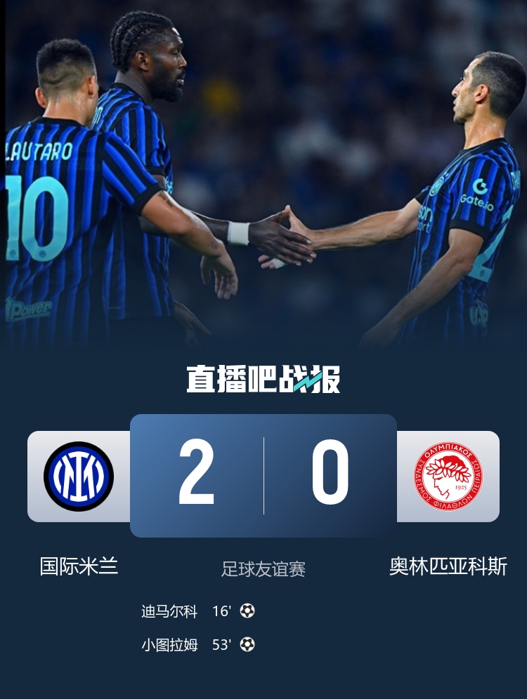友谊赛对阵,国米2-0击败奥林匹亚科斯,迪马尔科、小图拉姆破门。